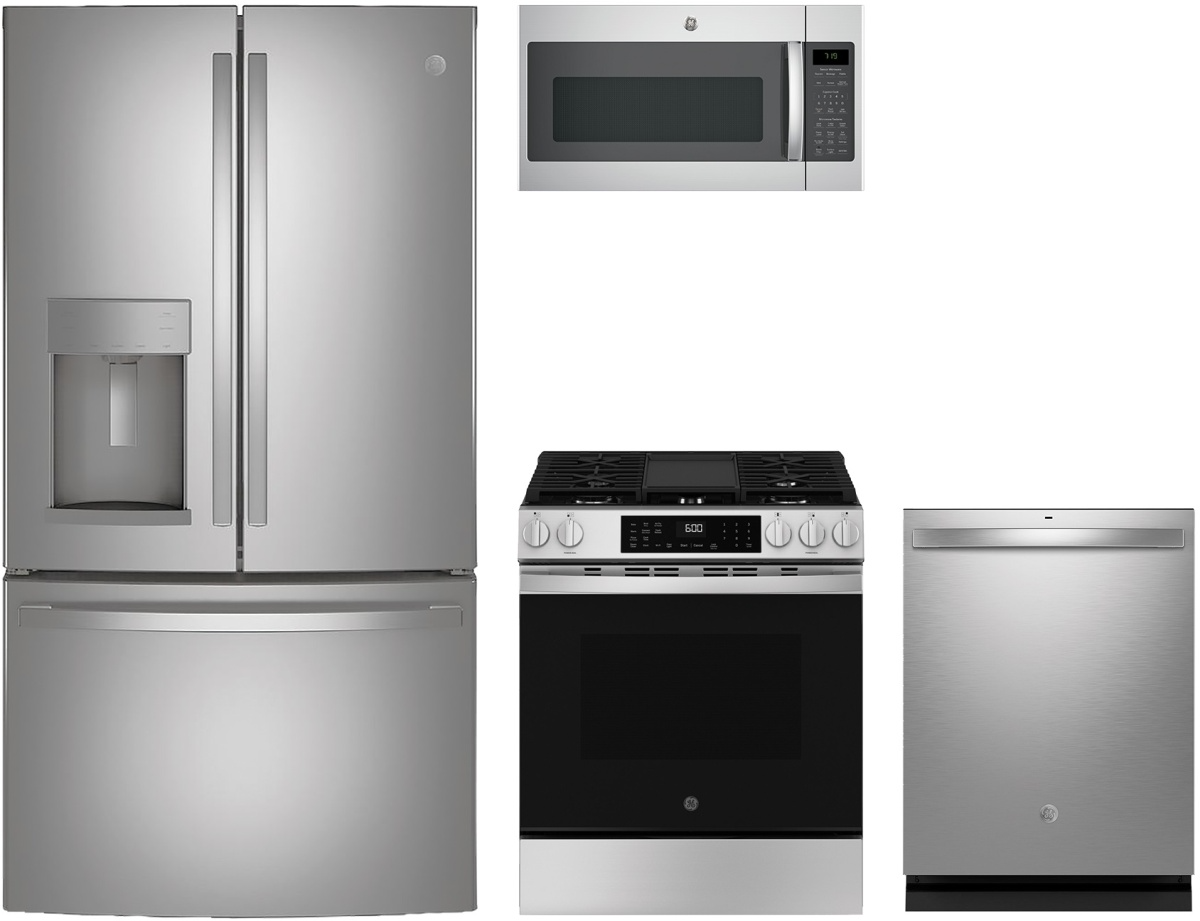 GE® 4 Piece Stainless Steel Kitchen Package with French door refrigerator, built in dishwasher, slide in gas range and over the range microwave.Read More