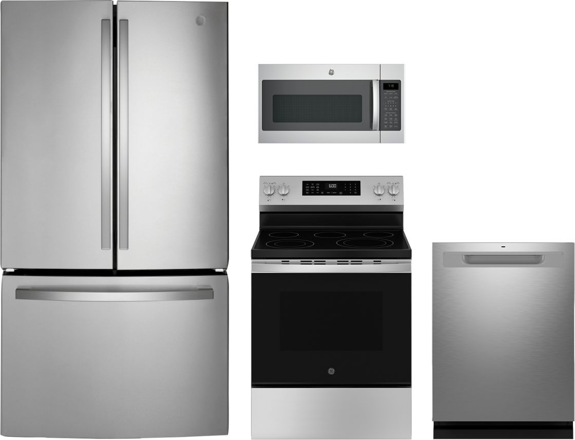 GE® 4 Piece Stainless Steel Kitchen Package with French Door Refrigerator, Freestanding Electric Range, Built In Dishwasher, and Over The Range MicrowaveRead More