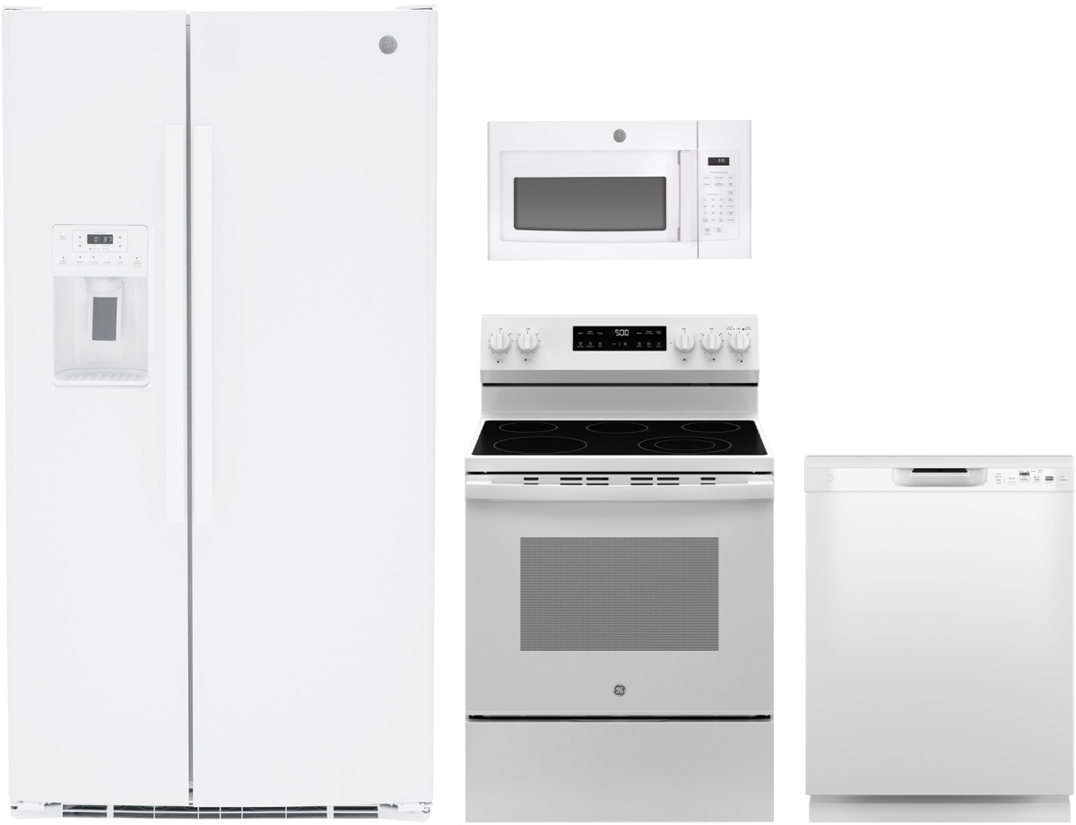 GE® 4 Piece White Kitchen Package with side-by-side refrigerator, built in dishwasher, freestanding electric range and over the range microwave.Read More